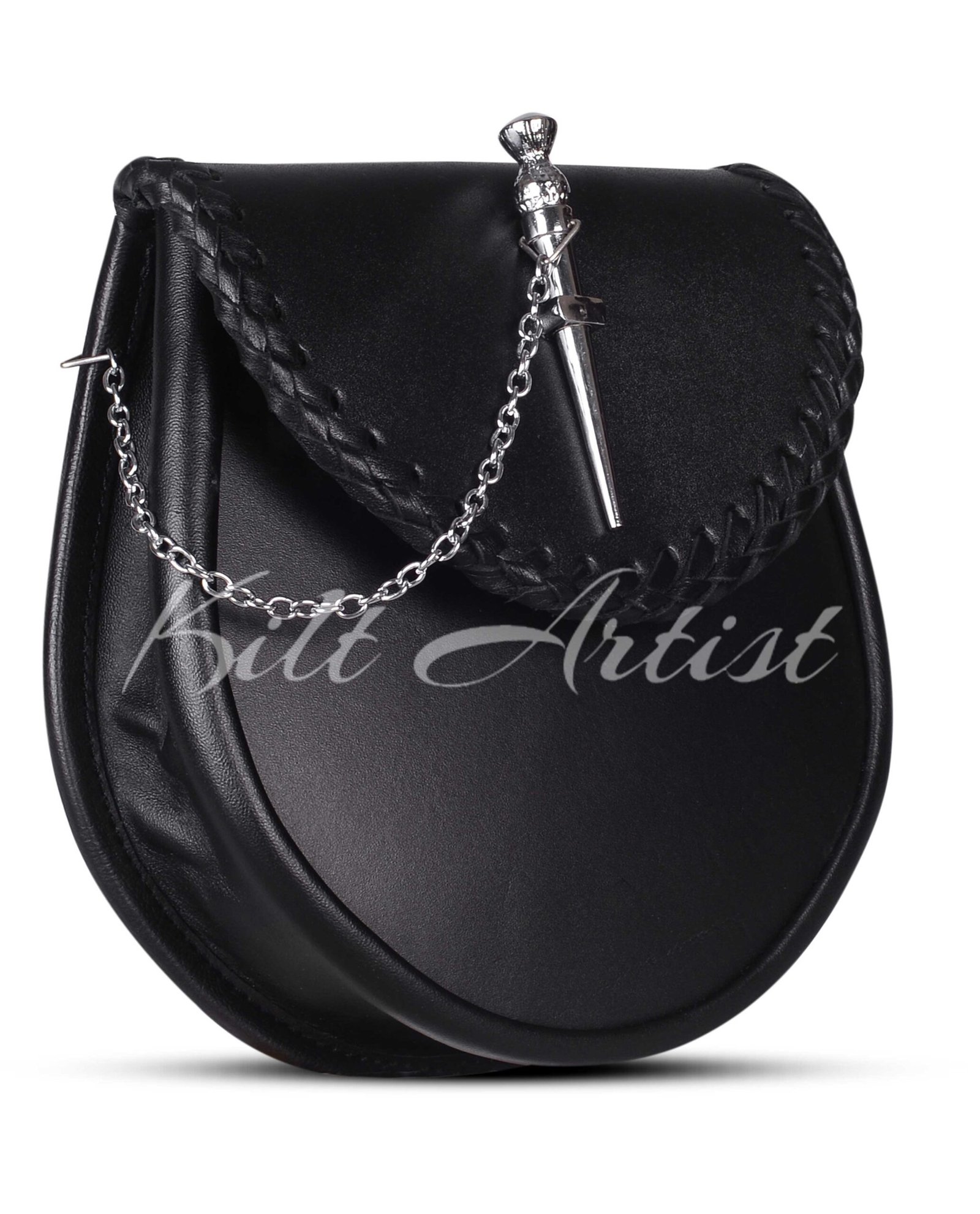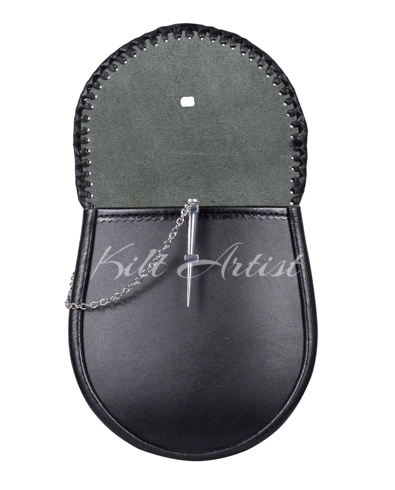 The classic black leather finish pairs effortlessly with all tartans, kilts, and Highland attire, making it a versatile accessory for any wardrobe. Its minimalistic design allows it to complement a wide range of outfits, from utility kilts to formal Highland dress. Ideal for kilt enthusiasts, bagpipers, and lovers of Scottish tradition, this sporran also makes an excellent gift for special occasions.