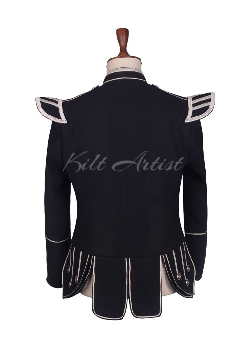 Expertly tailored from premium-quality black wool, this jacket offers a structured fit that enhances posture and provides a sharp, commanding appearance. The rich black fabric creates a strong foundation, while the intricate silver braided detailing across the chest, shoulders, and cuffs adds a distinguished and regal finish. These silver accents reflect classic Scottish military styling, making the doublet ideal for pipe band performances, parades, weddings, and ceremonial gatherings.