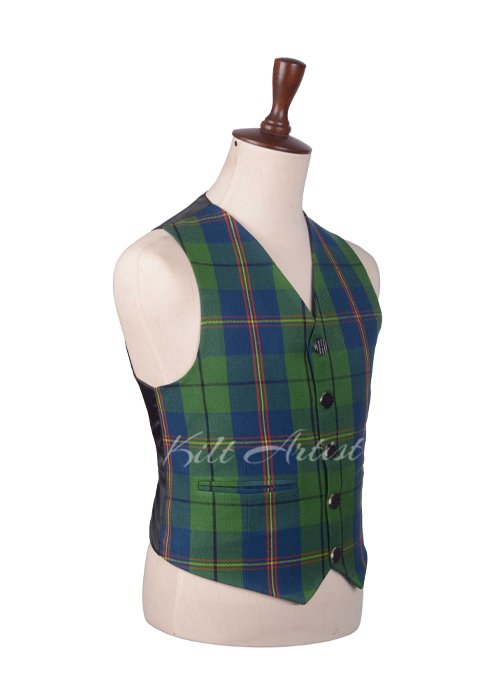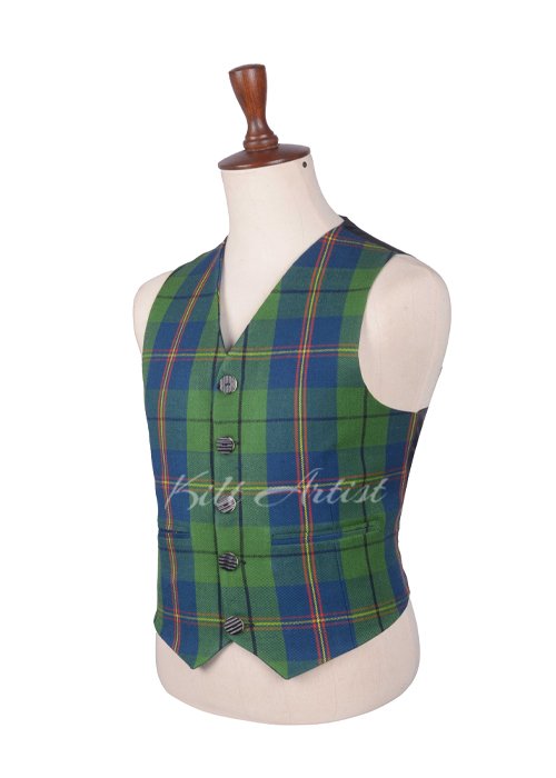 Made from premium-quality Carmichael tartan fabric, the waistcoat features rich, muted tones of green, blue, and black, reflecting the historic Carmichael clan design. The classic tartan pattern ensures versatility, pairing beautifully with kilts, Argyll jackets, or dress trousers, making it ideal for creating a polished Highland ensemble.