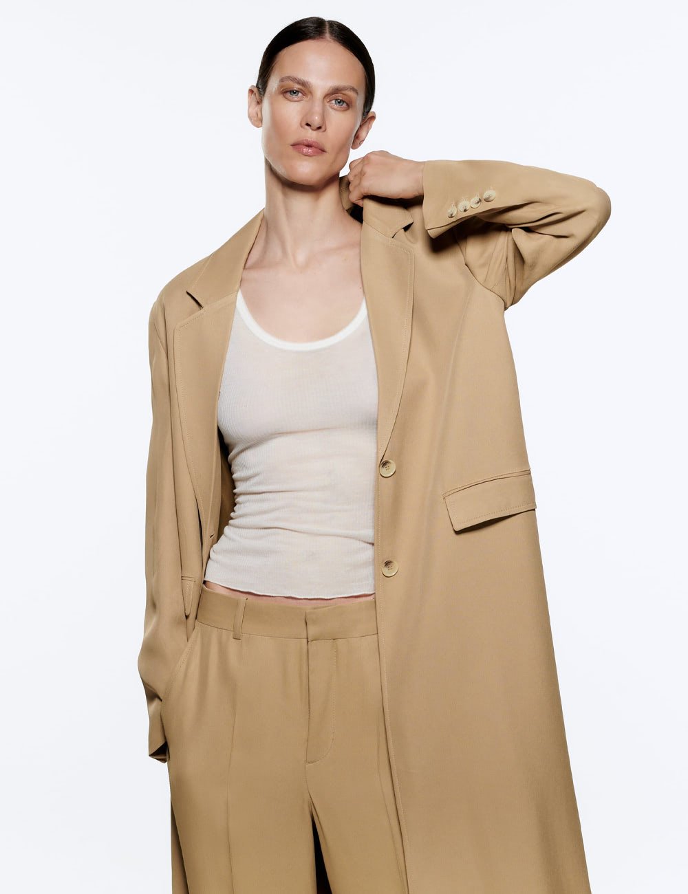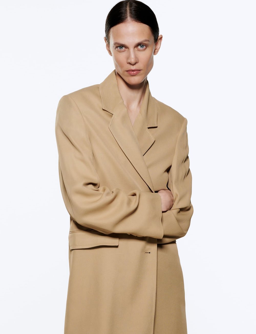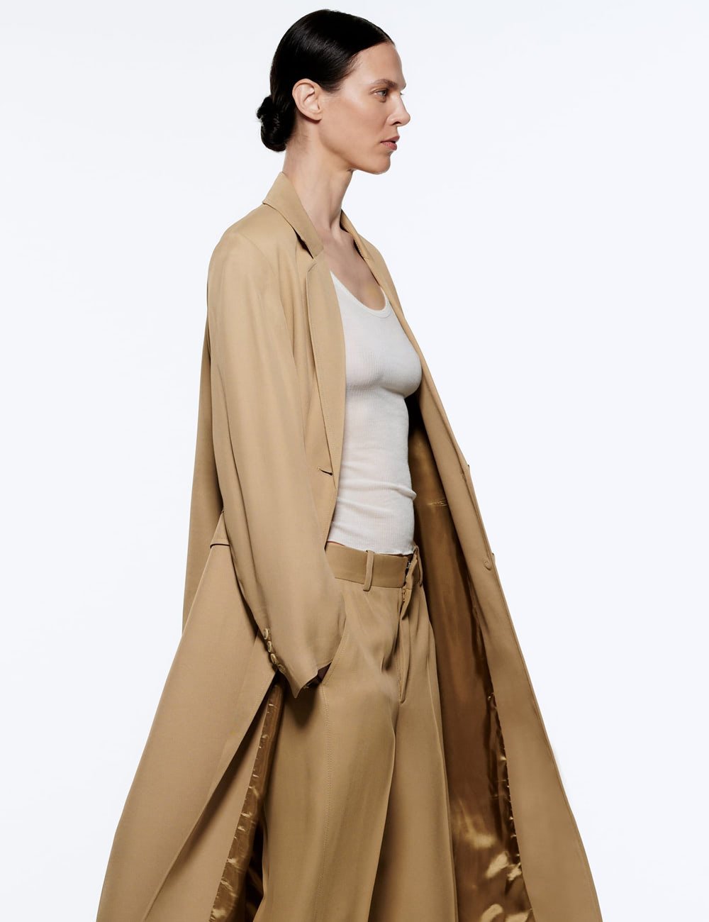 Cotton-blend fabric. Textured fabric. Long design. Evasé design. Wrap collar. Puffed short sleeve. Front slit. Knot detail. Bow closing on the back.