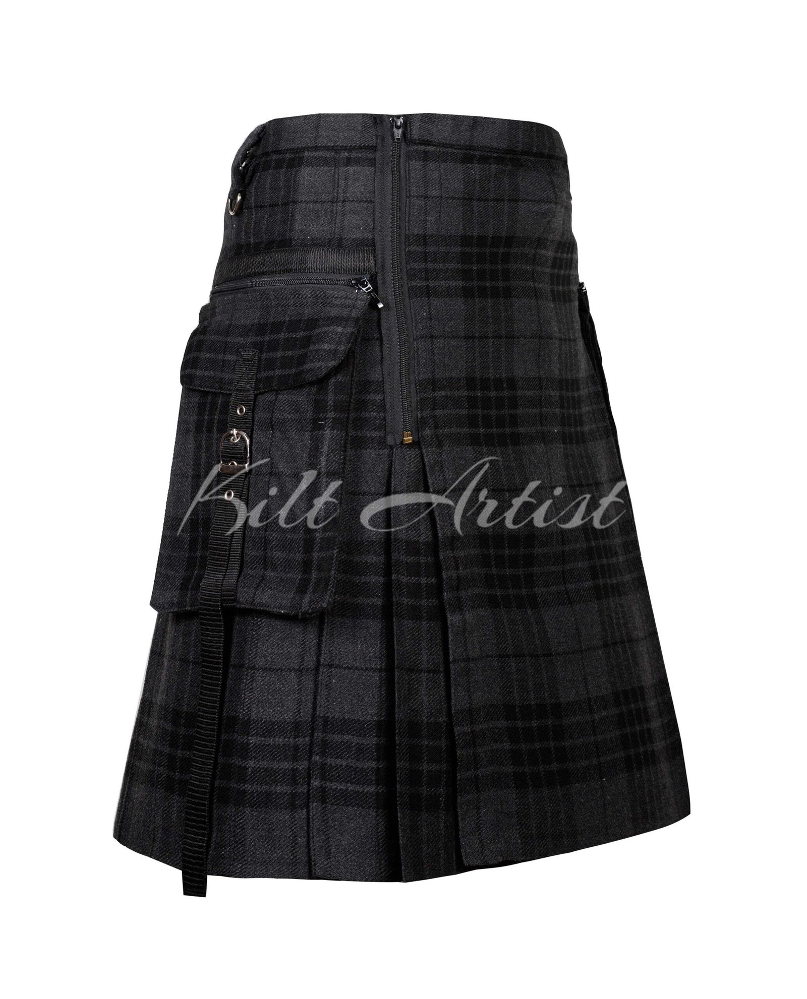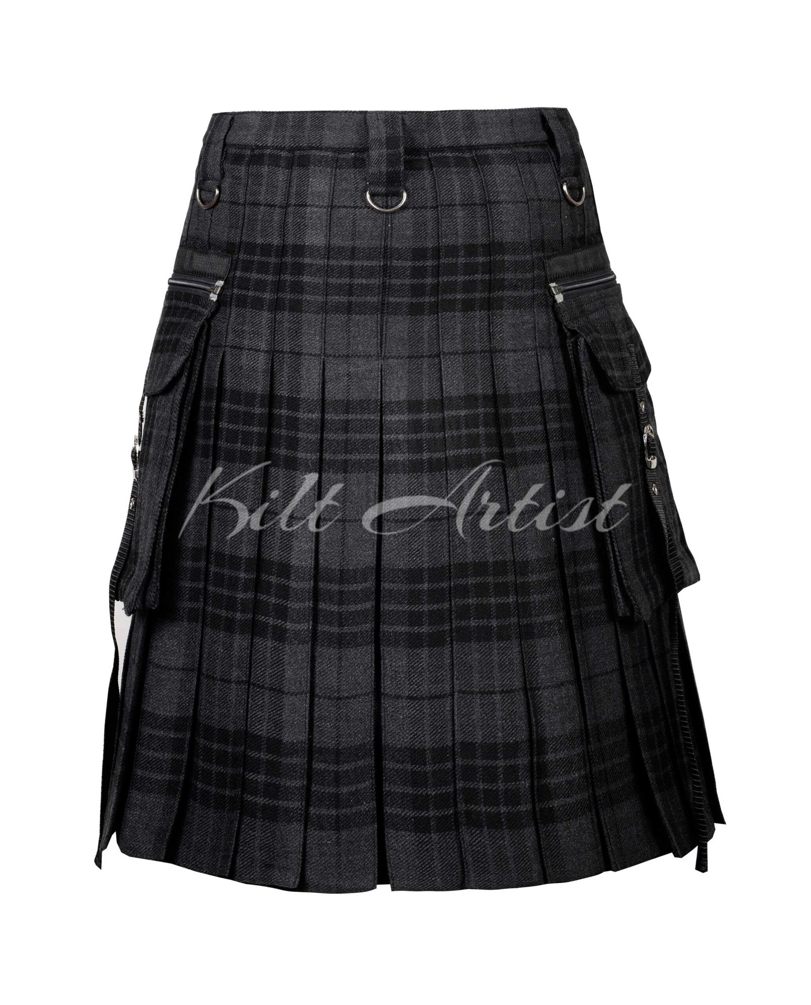 Make a bold statement with the Hamilton Grey Gothic Utility Kilt. This modern utility kilt features a striking Hamilton grey tartan design with gothic-inspired styling, blending traditional Scottish heritage with contemporary edge. Its unique look adds attitude and character to your outfit, making it ideal for festivals, streetwear, and alternative fashion.