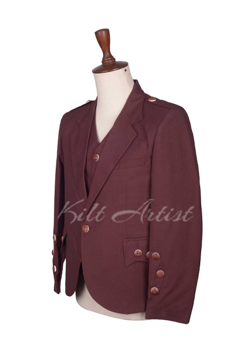 Crafted from premium-quality maroon wool, this jacket and waistcoat set offers warmth, durability, and a luxurious finish. The rich maroon shade adds a distinctive touch of sophistication, making it an excellent alternative to traditional black or gray. This color pairs beautifully with a wide range of tartan kilts, creating a striking and memorable Highland look.