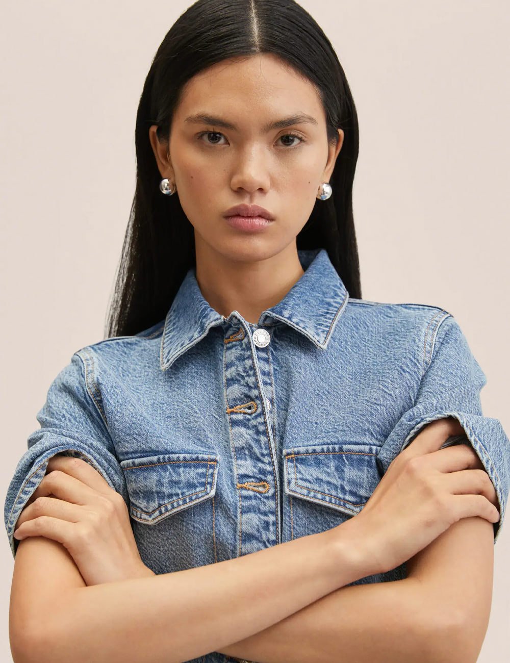 Cotton-blend fabric. Textured fabric. Long design. Evasé design. Wrap collar. Puffed short sleeve. Front slit. Knot detail. Bow closing on the back.