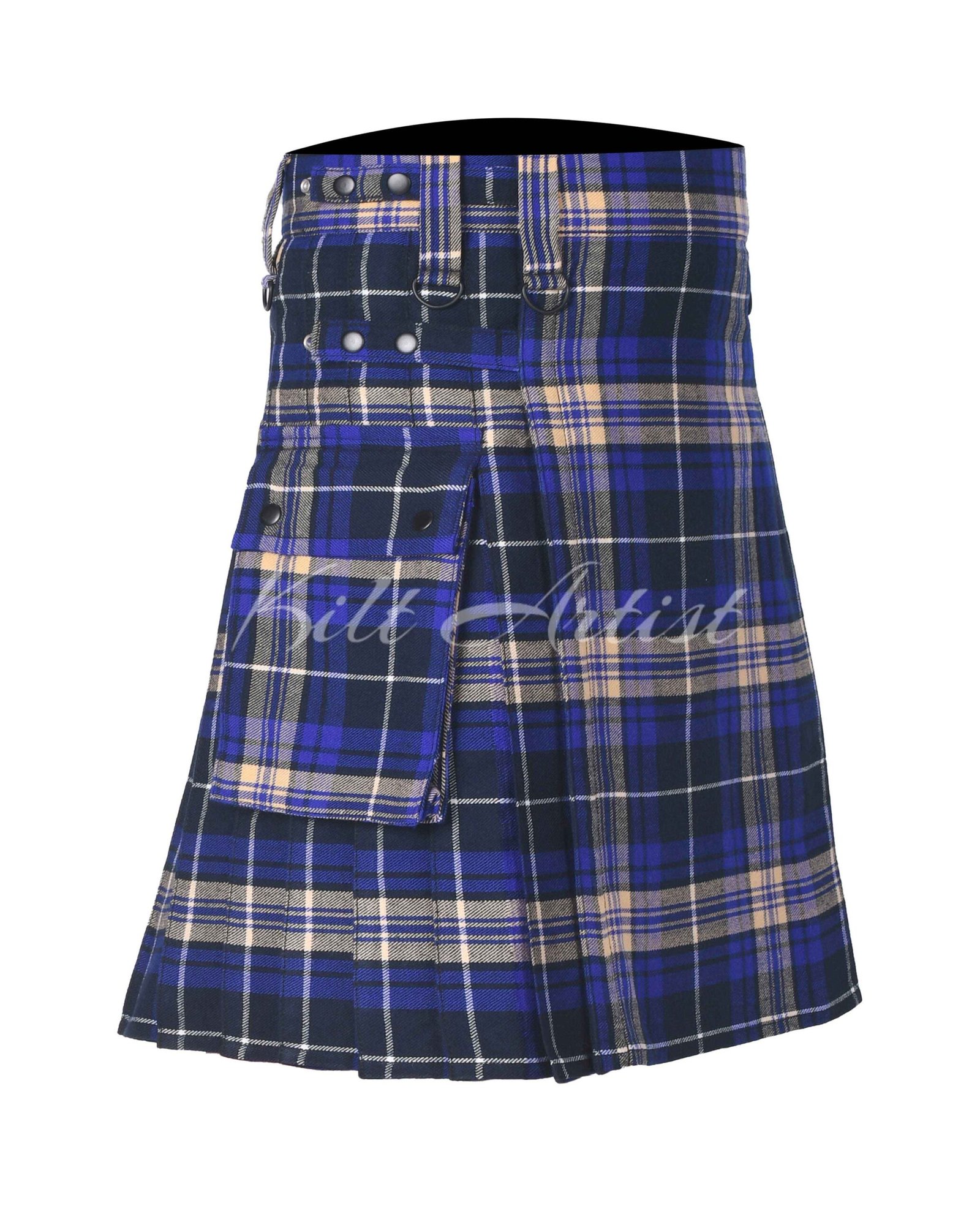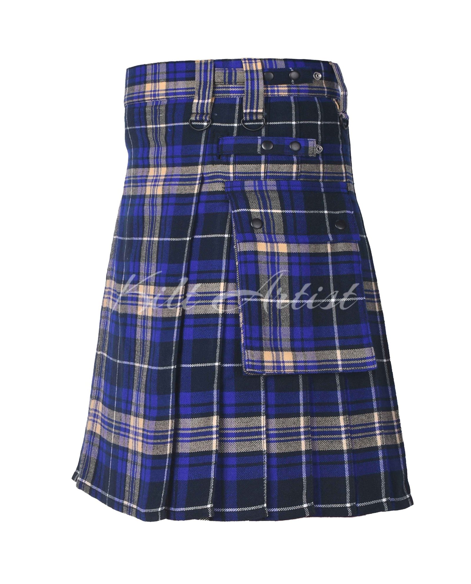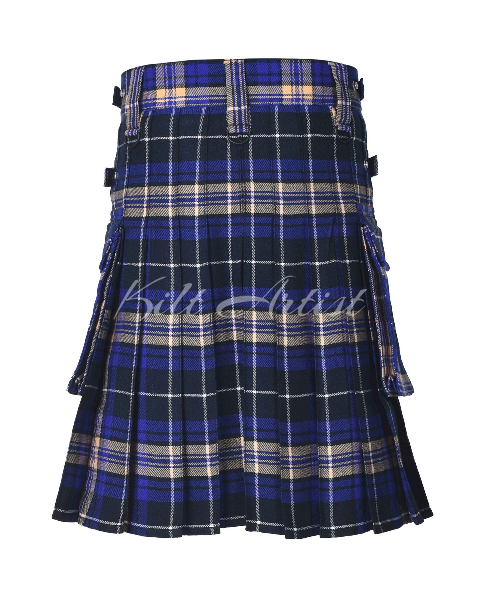 Adjustable leather straps paired with sturdy, rust-resistant metal buckles provide a secure and customizable fit. The knee-length cut offers freedom of movement without compromising the classic kilt silhouette.