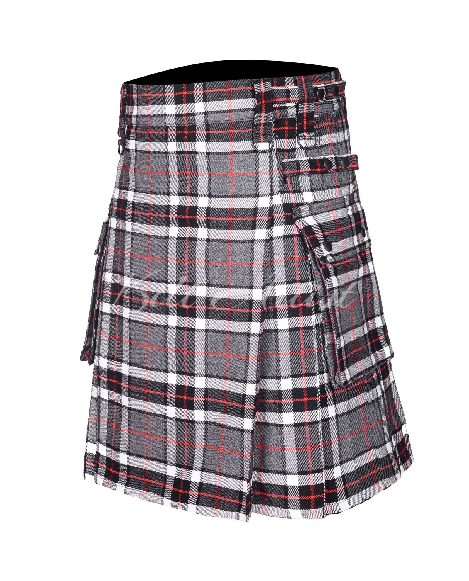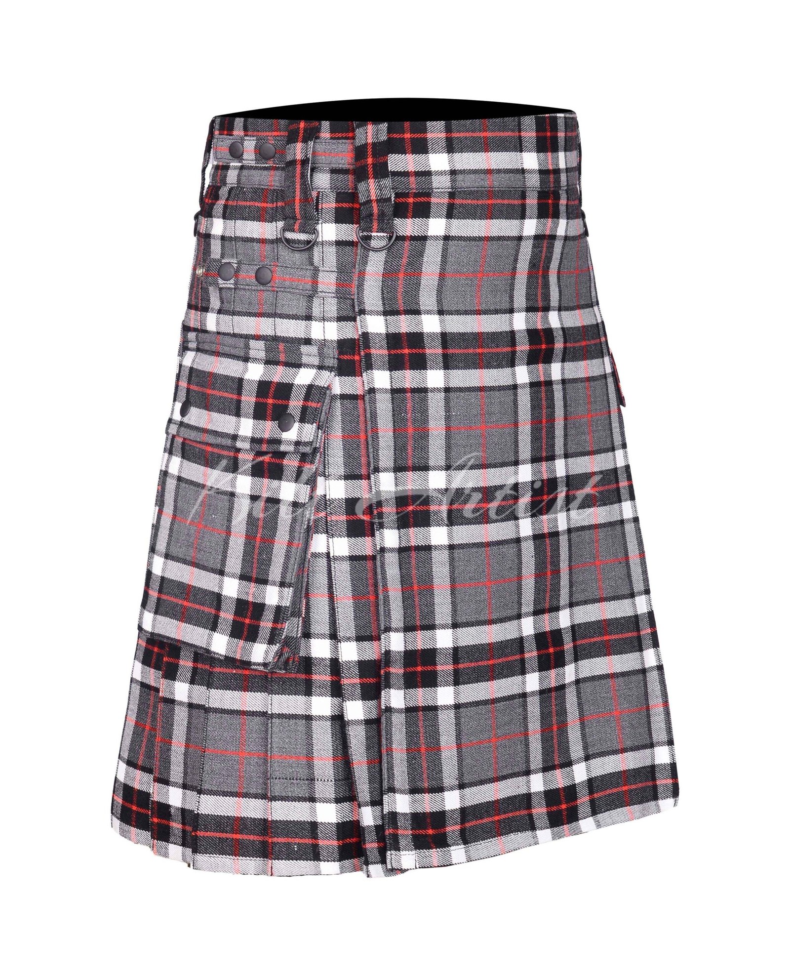 Built with functionality in mind, the kilt includes spacious utility cargo pockets on both sides, secured with snap button closures to safely store everyday essentials such as phones, wallets, keys, and tools. Adjustable leather straps with rust-resistant metal buckles provide a secure, customizable fit and enhance the kilt’s rugged yet polished finish.