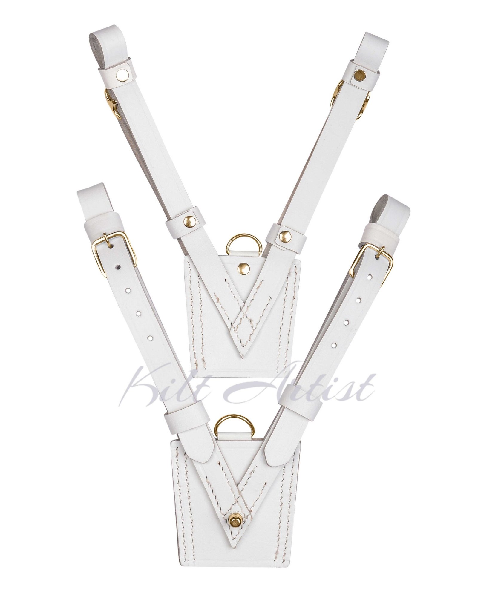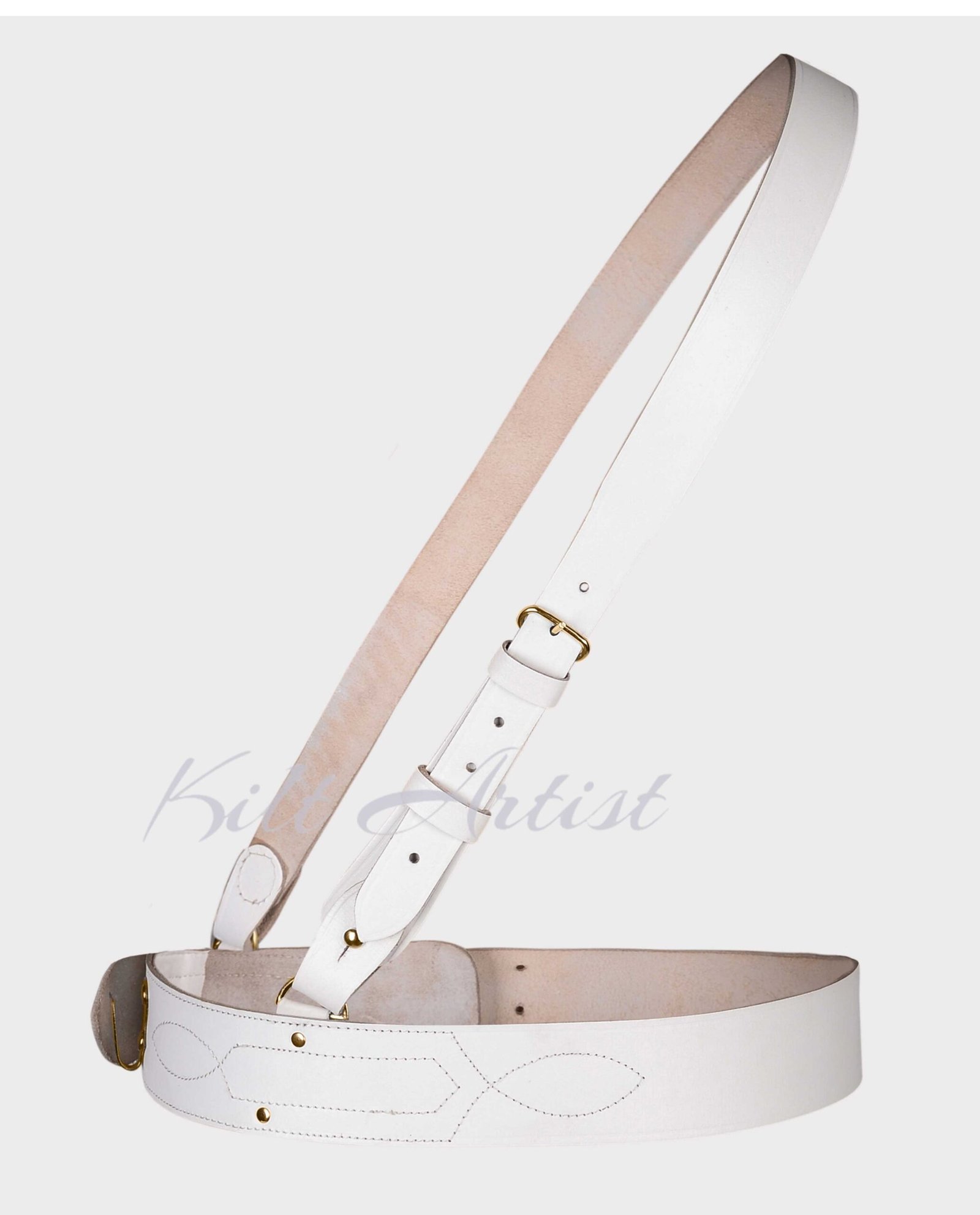 The White With Gold Accessories Sam Browne Kilt Belt is a striking and elegant accessory designed to enhance traditional Scottish Highland attire. Featuring a clean white leather finish paired with polished gold accessories, this belt offers a bold and sophisticated look that perfectly complements formal kilt outfits. Whether worn at weddings, ceremonial events, Highland gatherings, or cultural celebrations, this Sam Browne belt adds a refined finishing touch to your traditional ensemble.